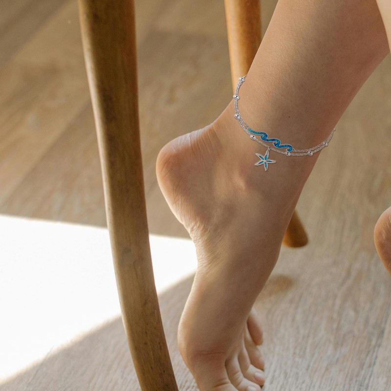 DAYLINLOVE Anklet with Starfish and Waves Sterling Silver Anklet with Blue Opal Starfish and Waves Multilayer Ocean Waves Jewellery for Women, Sterling Silver