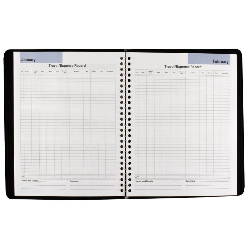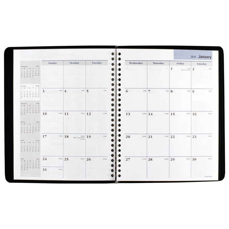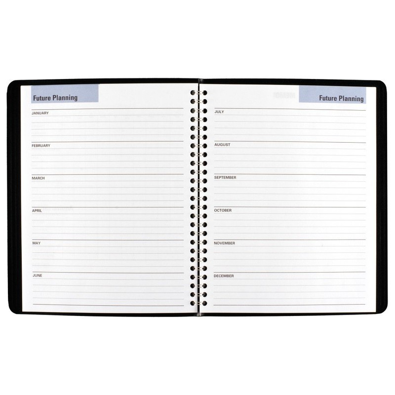 - Memo section with notes space; Julian dates; printed in blue and black ink on quality paper containing 30% post-consumer waste; black simulated leather cover; 7.38 x 9.13 x .38 inches overall