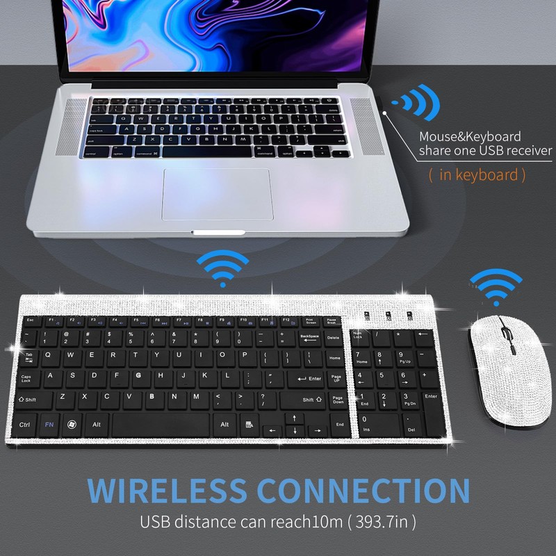 This Luxury Bling Rhinestone 2.4G wireless mouse and keyboard is compatible with Windows 98,Vista,7,8,10 and higher as well as Mac OS, Google Chromebook etc. Full size and ultra thin keyboard and mouse-great for home , office , classroom etc .
