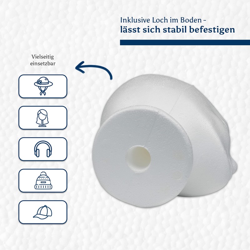 - Box contents: 3 x white polystyrene head with a head circumference of 52 to 54 cm and a height of 26 cm. We also offer sets of 2, 6, 12, 18 or 22 Styrofoam holders