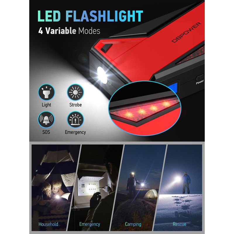 - OVER 10 MILLION UNITS SOLD: DBPOWER has over 10 years of experience in this field, we provide a safe and reliable products, 12 months of hassle-free warranty, and lifetime technical support. Contact us anytime with any questions. The package includes one Jump Starter, one intelligent jumper clamps, one USB charging cable, jump starter carry case, and user manual.