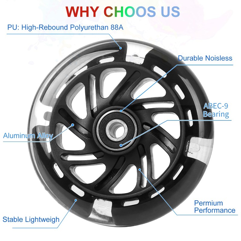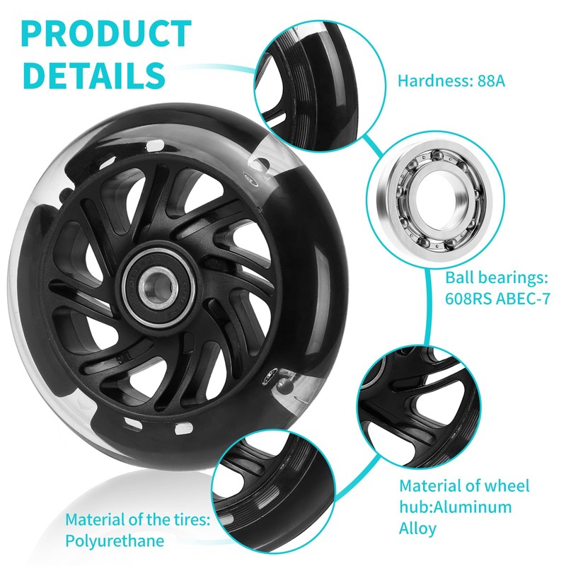 - Easy installation: these LED light wheels are easy to install and fit most scooters. Thanks to the high-quality bearings and durable 88A urethane construction, they are durable and offer a low-friction driving experience.