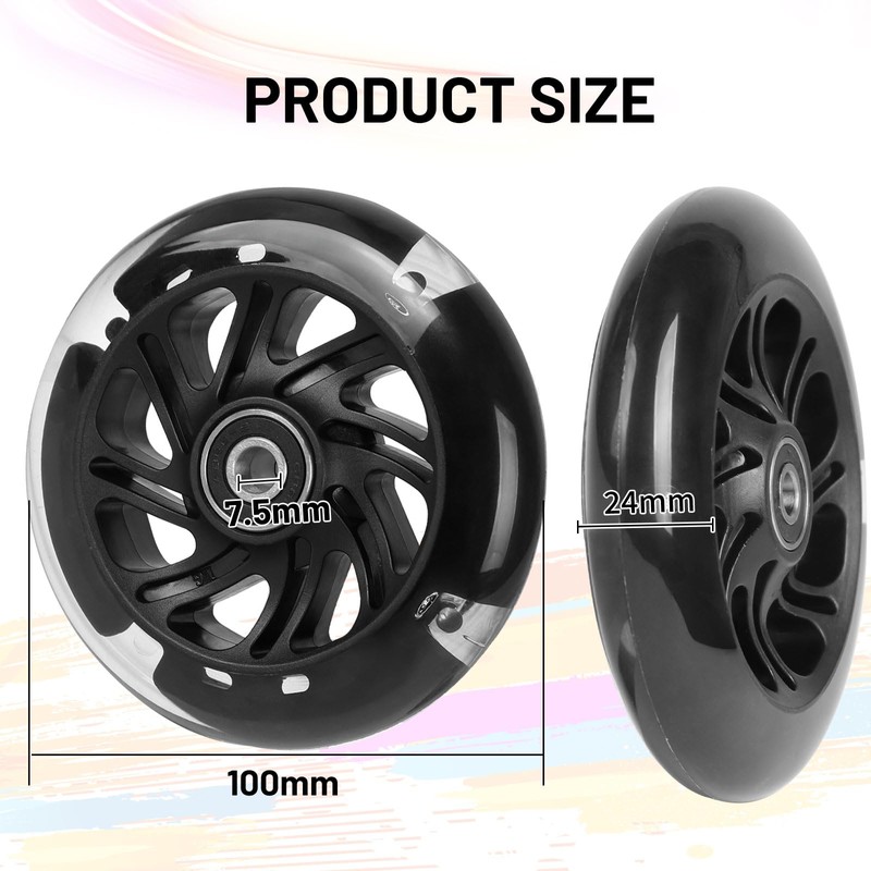 - Versatile use: these 100 mm LED scooter replacement wheels fit different scooters and offer a stable and low-friction ride on different terrain - from roads to sidewalks to skate parks.