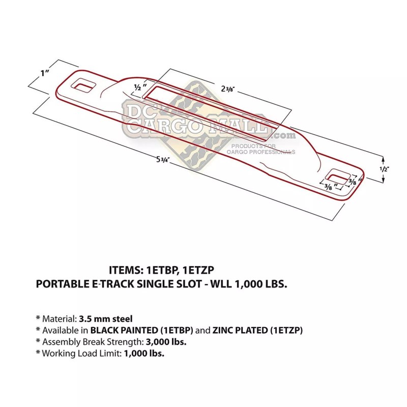 Advantages Of The Innovative E-Track Single The E-Track single is the perfect solution for those who want to lock their load with straps but don't have the room or the need for an entire track. It can be used just about anywhere to protect every size load - whether a small grill or a full-sized motorcycle. Like a standard E-Track rail, the single can be mounted on a surface and used as an anchor point for ratchet straps, tie-offs, and other products equipped with E-Track fittings. The distinction is that this portable E-Track slot is significantly more variable. It can be placed in small spaces like tailgates, garages, corners of trailers, etc. and can be affixed in whichever direction necessary at the moment, then changed later for a new use. The E-Track single is a most handy device that can make transport and stowage of cargo considerably simpler. E-TrackSingle Trailer Plate Durability And Specs This 5-3/4" long and 1" wide E-Track single is made of hardy 3.5 mm steel that will tolerate rough elements and heavy use for years and is painted a smooth black finish. It has a break strength of 3,000 lb. and a working load limit of 1,000 lb. It is also available in a zinc-plated style, which improves corrosion- and rust-resistance. How To Use The E-Track Single Slot To fasten the E-Track single to any metal or wood surface, use bolts and nuts or screws. Our E-Track hardware kit comes with enough fasteners for installing two single slots Once the single is mounted, connect logistic straps, wheel nets, rope tie-offs and steel tie-downs, or any other equipment with simple E-Track fittings to the E slot to contain anything from small toys to tables. When you are done with the load, just remove the E-Track single and re-drill where needed. Versatile and easy!