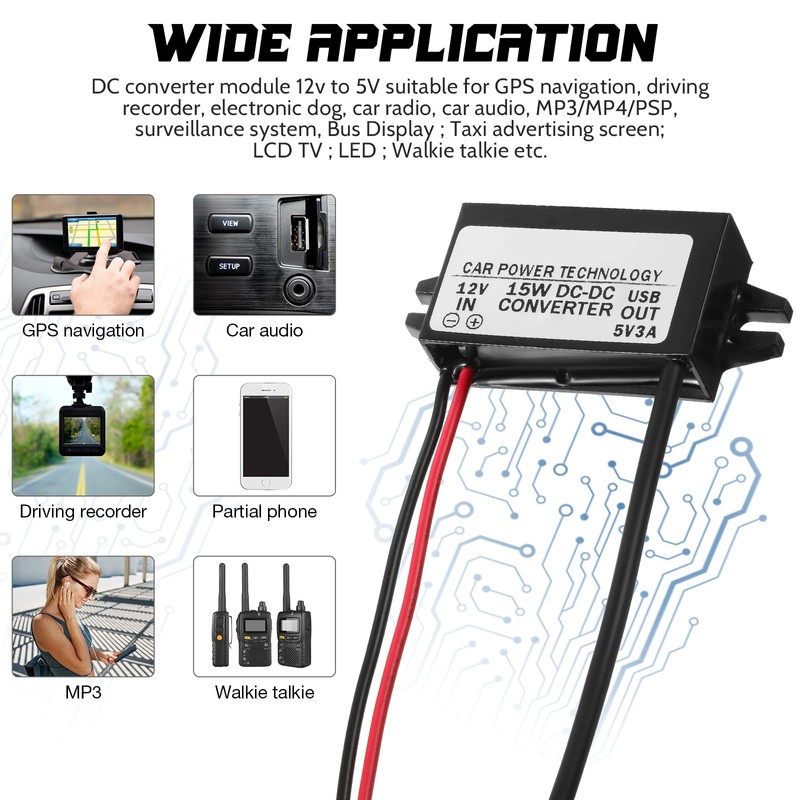• 12V to 5V USB converter: input voltage: DC8-20V, 12V changes to 5V; Output current: 3A max; No-load current: 10mA; Output power: 15W max
