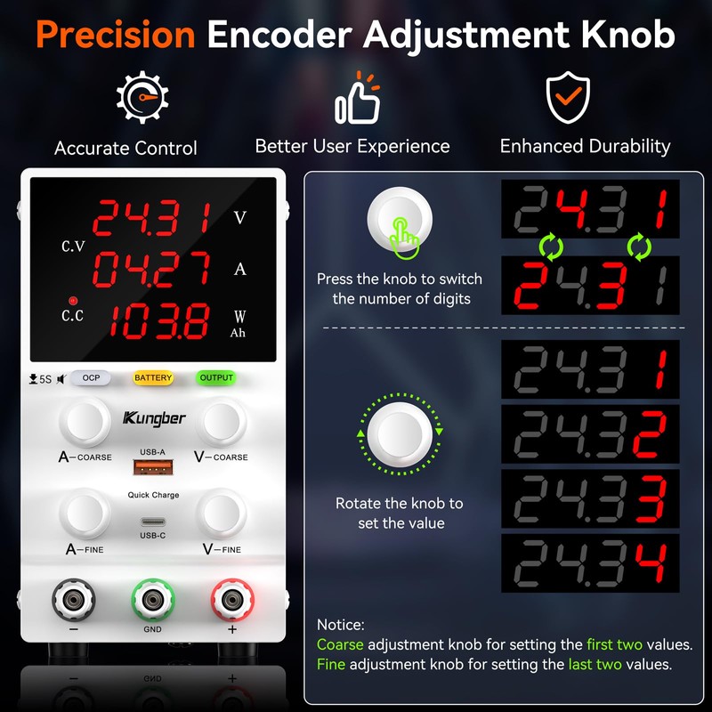 - What You Get - 1 x Kungber Variable DC Power Supply, 1 set of Output Power Cords , 1x Input Power Cord, 1 x User Manual, and Technical Support from Kungber.