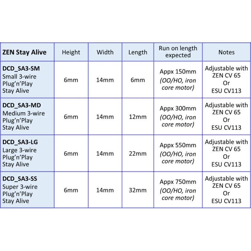 Usable with Zen Black, Zen Blue+, Lenz and ESU or any decoder with three-wire connections for Stay-Alive. Please note that connection of a DCCconcepts Zen Stay-Alive to a non-DCCconcepts decoder may invalidate your warranty, please check documentation which came with your decoder for details.