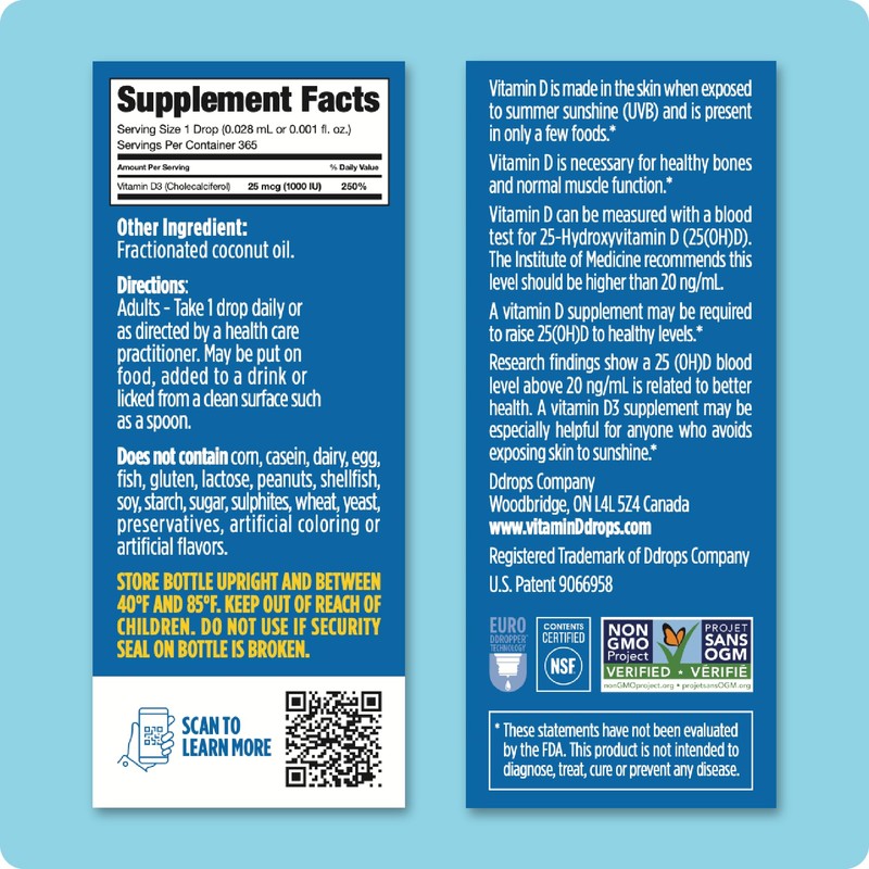 Ddrops 1000 IU are a welcome option for liquid vitamin D for adults, without the need to swallow vitamin D pills or capsules. All of our Ddrops products are filled to the specific number of dosages listed on the bottle, box and insert. The bottles are not filled to the very top, so they will appear to be partially full. This is for ease of use, safety and label readability.