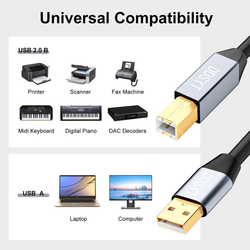 - Ideal Printer Scanner Cable: DDSYT USB 2.0 printer cable is ideal for connecting your scanner, printer, server, hard drive, camera, piano, and other USB b devices to a laptop, computer (Mac/PC), or other USB-enabled devices for data transfer.