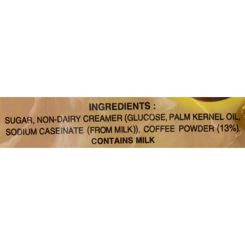 - Ingredients: Sugar, Non-Dairy Creamer (Glucose, Palm Kernel Oil, Sodium Caseinate (From Milk)), Coffee Powder (13 percent ). Contains Milk