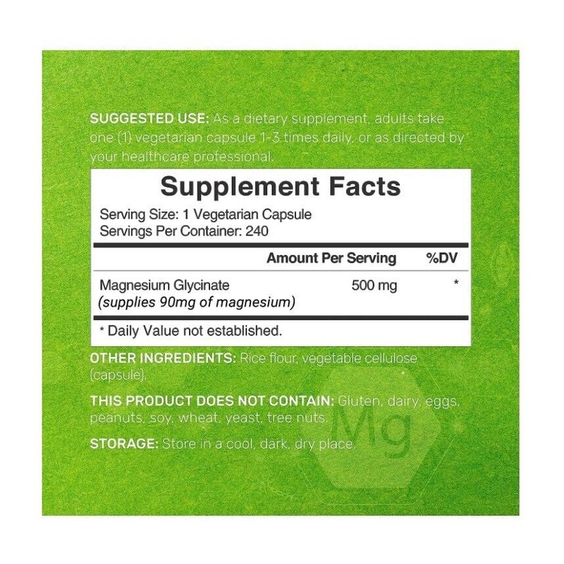 • Dosage & Servings – Only 1 vegetarian capsule per serving to receive 500mg of pure magnesium glycinate. Each bottle offers 240 veg capsules and up to an 8-month supply.