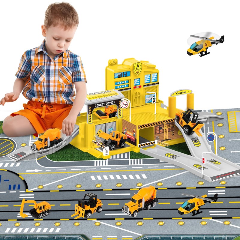 - HIGH QUALITY MATERIALS FOR KIDS The construction toy set is made of kid-friendly ABS plastic, which is non-toxic and durable to make this technical garage toy safe for children. The excavator and helicopter are pre-assembled, and the soft all-round design allows toddlers to push and pull the cart with their little hands without worrying!