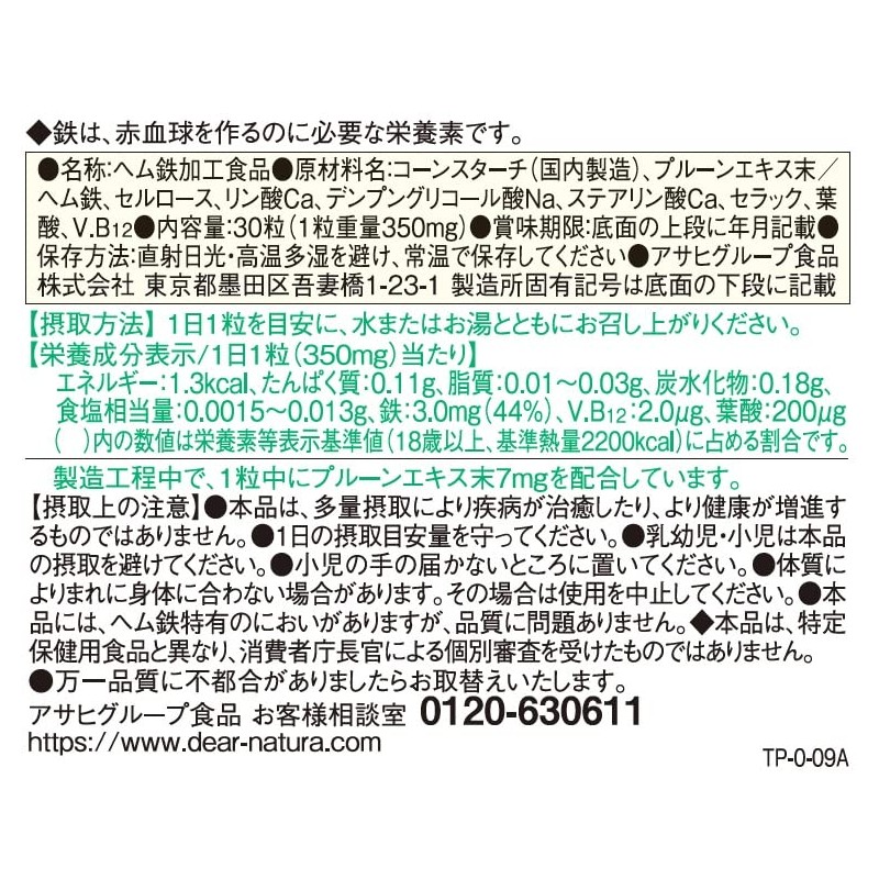 - Ingredients: Cornstarch (made in Japan), Prune Extract / Hemiron, Cellulose, Calcium Phosphate, Sodium Starch Glycolate, Calcium Stearate, Shellac, Folic Acid, Vitamin B12