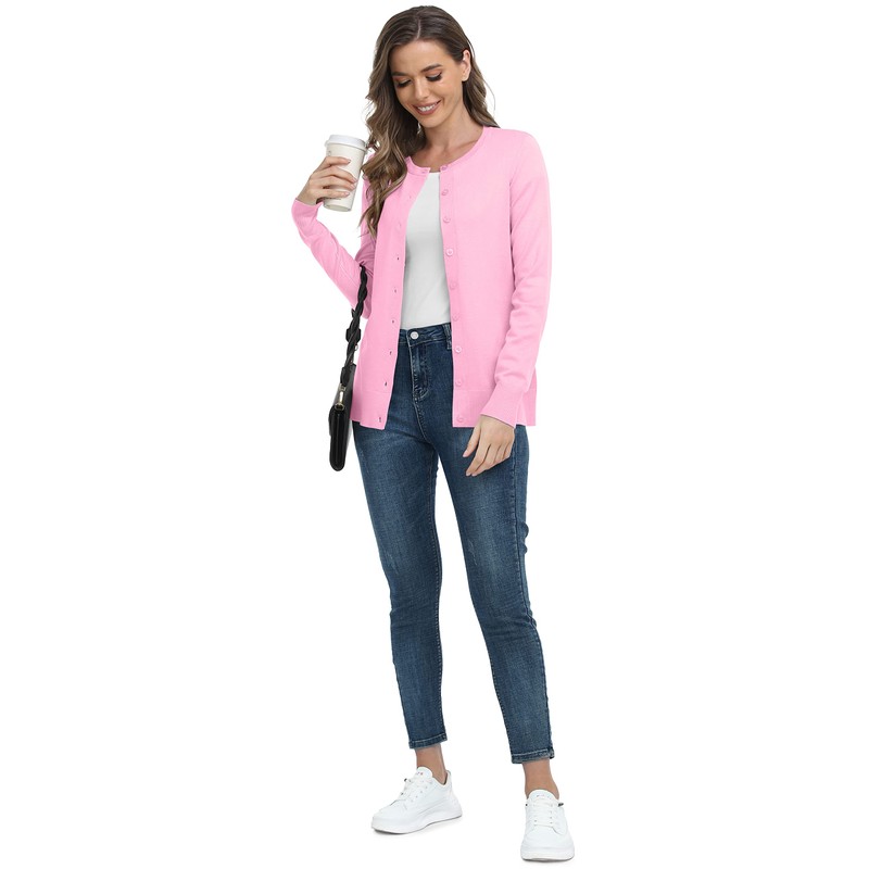 - Features: Casual cardigan with crew neck, long sleeves, button placket, plain colours and short knitted length. This classic basic cardigan for women with a tailored design that flatters your figure.