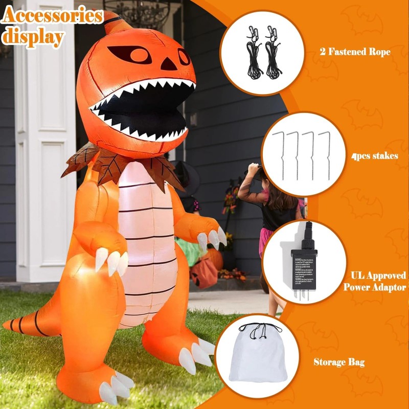 【Terror Halloween Design】: The Halloween inflatable orange dinosaur about 8 FT, which is a large size for Halloween outdoor decorations. The head of this dinosaur is a pumpkin with its big mouth open and sharp teeth exposed , add terror atmosphere to your Halloween night.
