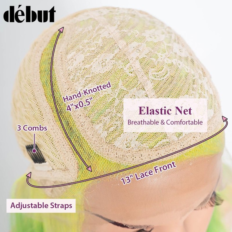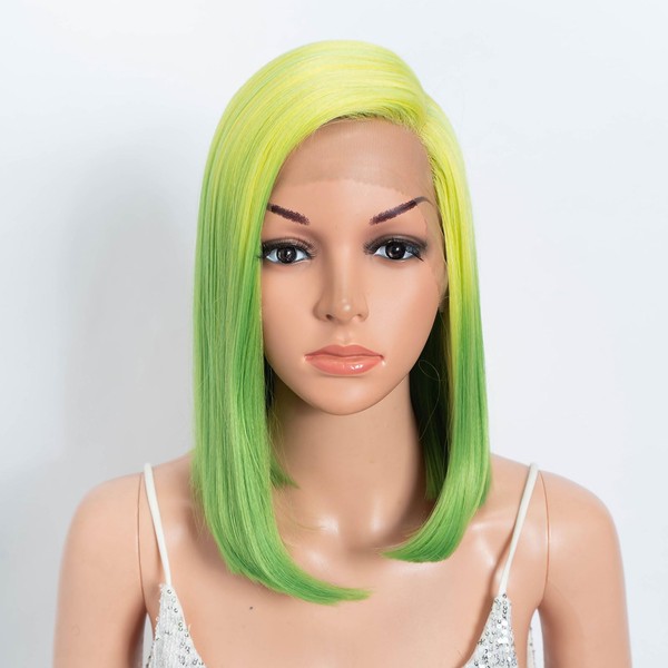 DÉBUT Ombre Lemon Green Asymmetrical Side Part Long Bob Wig Synthetic Lace Front 13x4x0.5 Natural Hairline Shoulder Length Wig for Women 12 Inches Neon Green Color