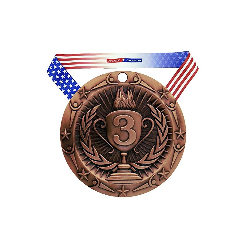 Decade Awards 3rd Place World Class Engraved Medal, Bronze - 3 Inch Wide Third Place Medallion with Stars and Stripes American Flag V Neck Ribbon - Customize Now