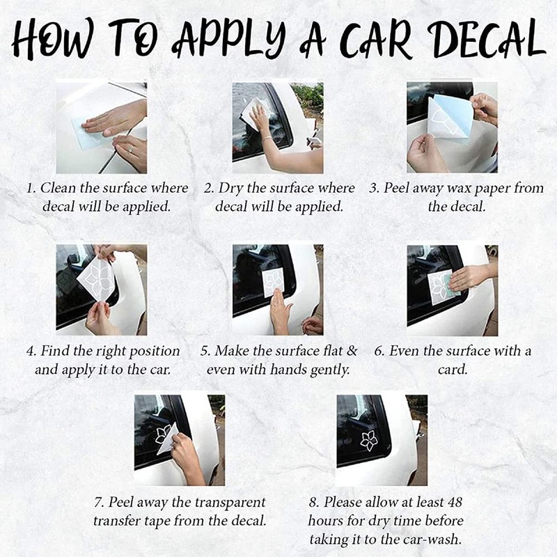 - Vehicle Window Decals: recommended size 5 - 14". Varies per vehicle and placement area.