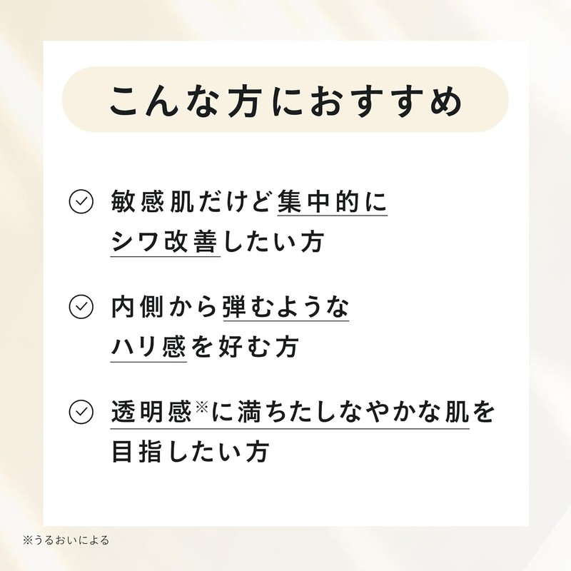 - No synthetic fragrances / No colorings / No alcohol / Allergy tested (does not guarantee that allergies will not occur in all people) / Continuous use tested with the cooperation of people with sensitive skin (does not guarantee that it will be suitable for all skin types)
