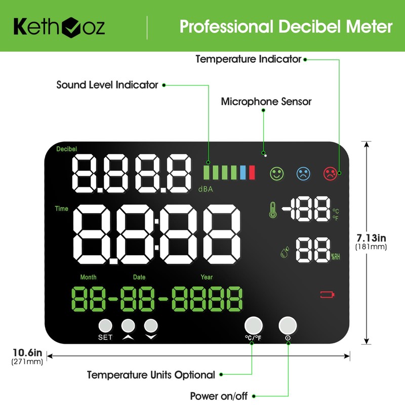 - 【Multi-purpose Decibel Meter】As well as being able to monitor sound, this multifunctional noise meter also measures temperature, humidity and time.The display is equipped with temperature indicator and noise analog bar icon patterns, allowing this digital sound level meter to balance the surrounding environment from multiple dimensions.
