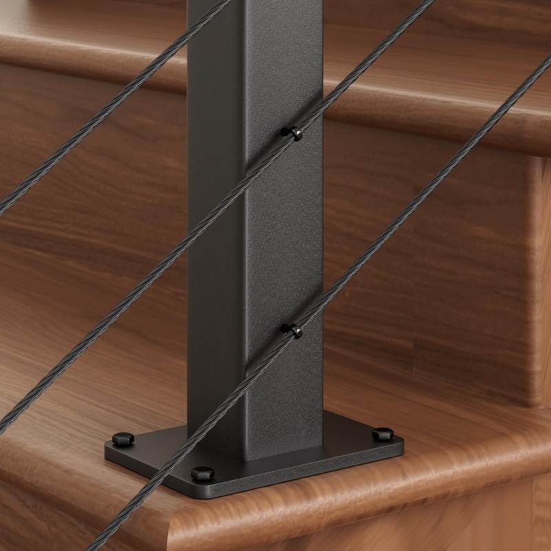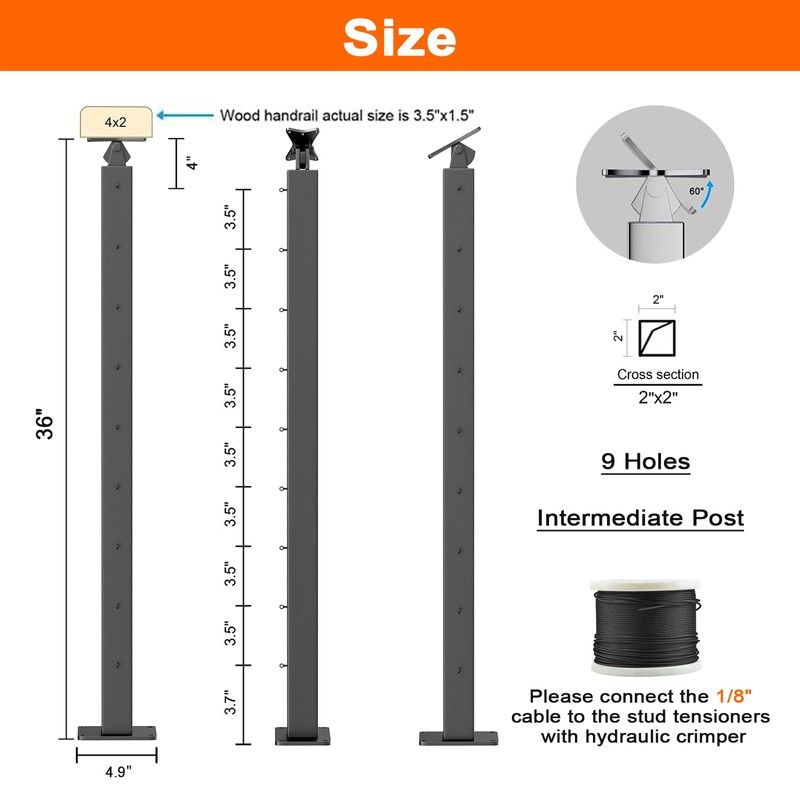 - 【Size 】Outboard Intermediate post is 36'' in height, and 2"×2" in square width; Both baseplates are solid welded with the square post as an intergraded part. This unique design not only reduces your labor cost but also lowers the difficulty of installation, Each post fits a 1/8 inch cable railing.