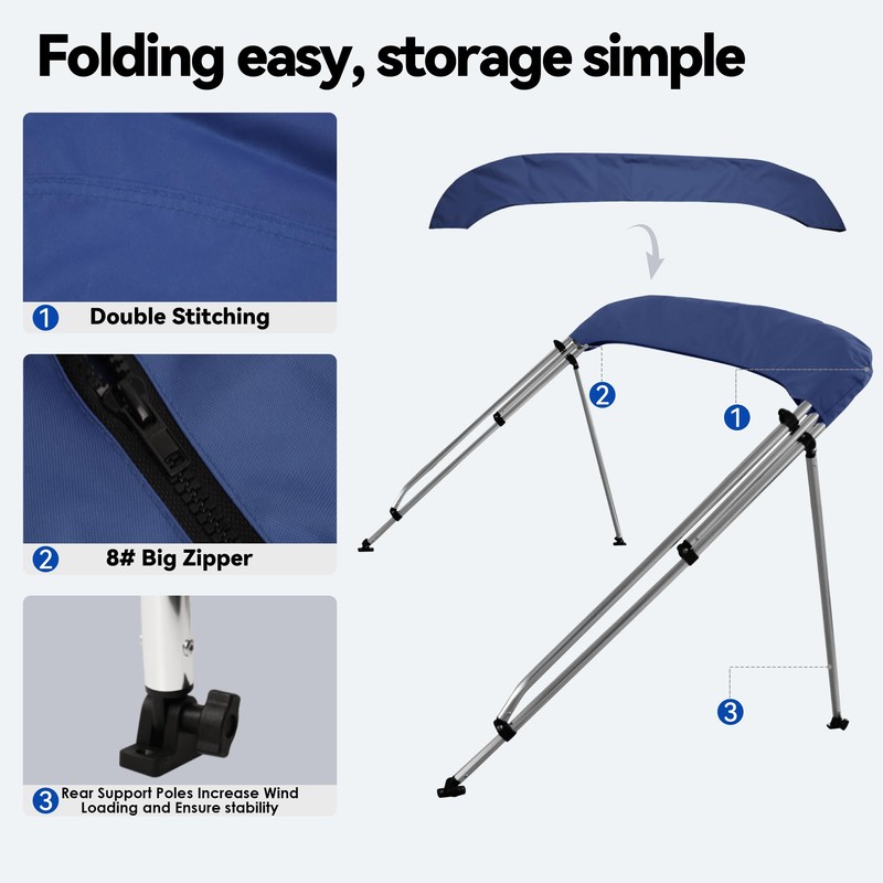 - Simple Installation and Storage: The boat canopy comes with 2 rear support poles and 2 front straps which ensure stability & fast fold. Additionally, it includes a zippered storage boot that is dust and waterproof, ensuring the safety of your bimini top when not in use.