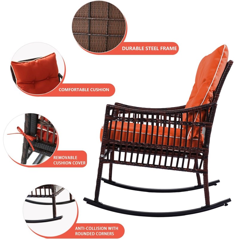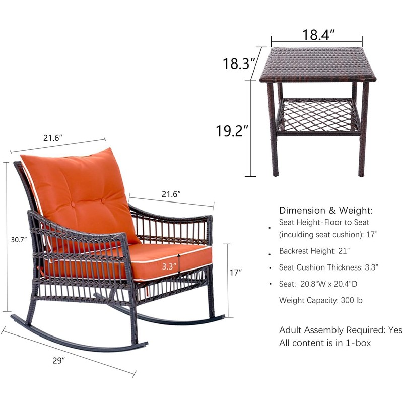 - ENJOY & RELAX: This rattan rocking chair sets including 2 x rocking chairs with seat cushions, 1 x side table with glass. Enjoy your leisure time in this wicker rocking chair. You can rock the chair slowly and gently, which is sure to bring you a fantastic feeling.