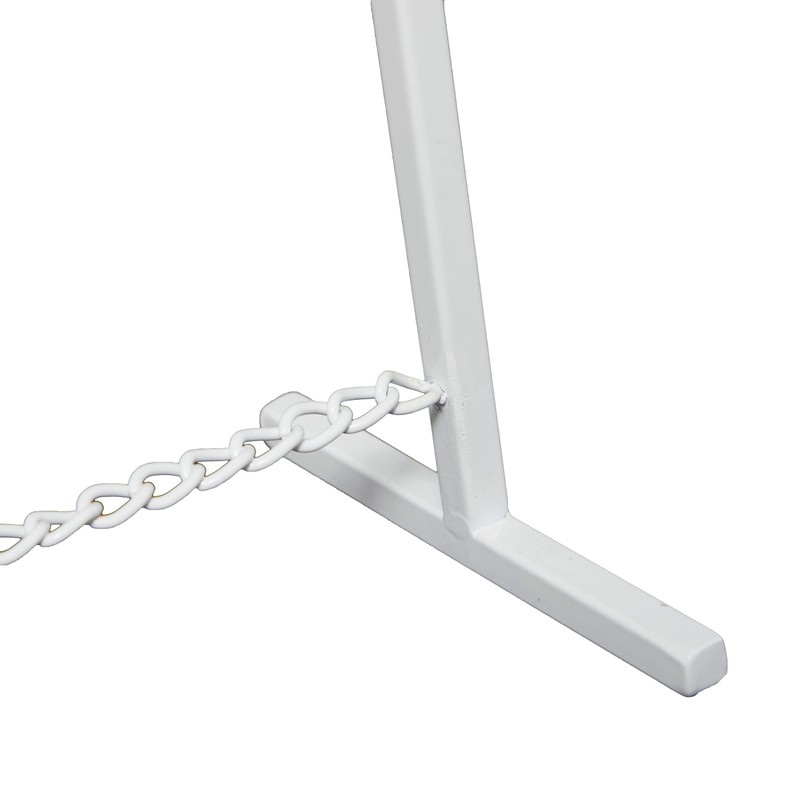 - WHITE MATTE FINISH White easel with an iron frame, clean lines, simple angled feet, and white chain