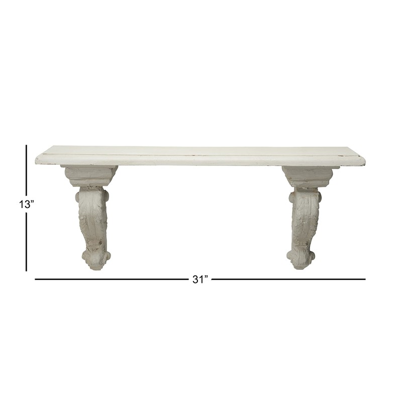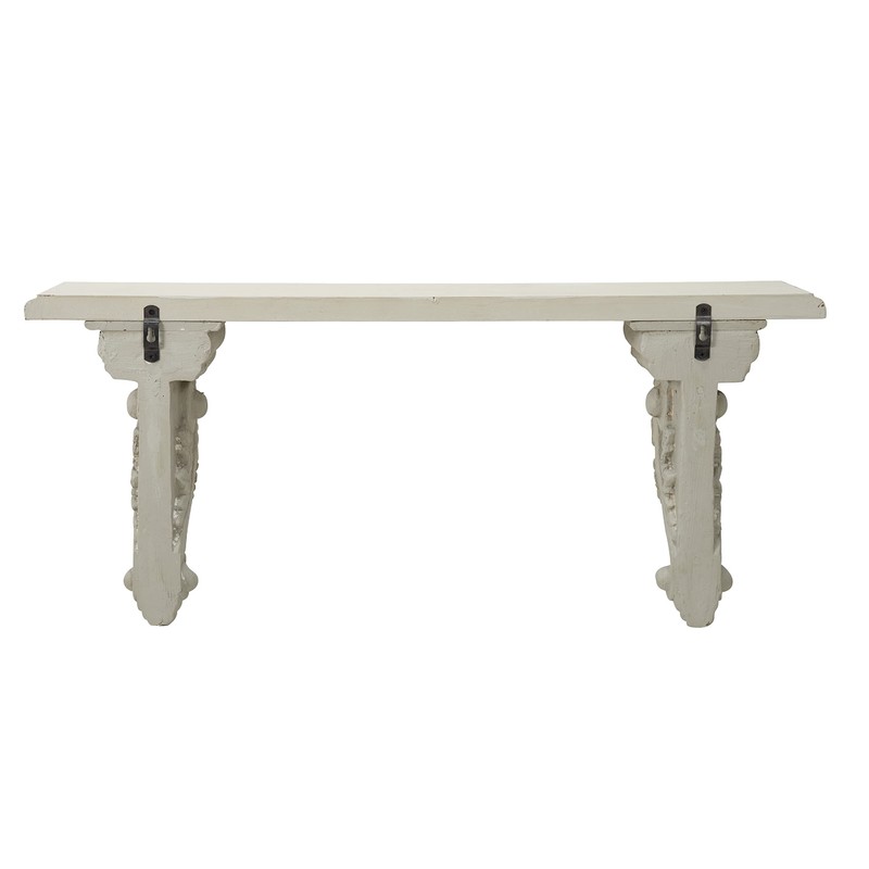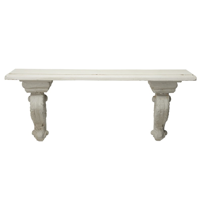 • This white wall shelf features carved wood panel with carved scrollwork brackets