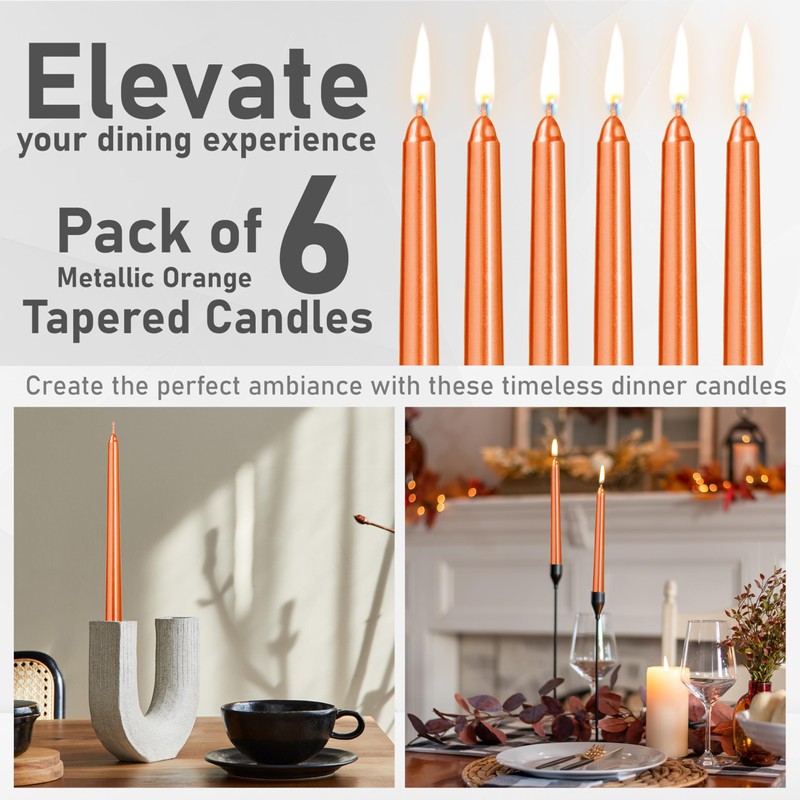 DECO EXPRESS Candles Set Classic Dripless Tapered Metallic Unscented 8H Burning Time, Decorative Dinner Candles for Restaurant Home Christmas (Metallic Orange, 6 Pack)