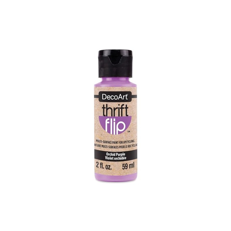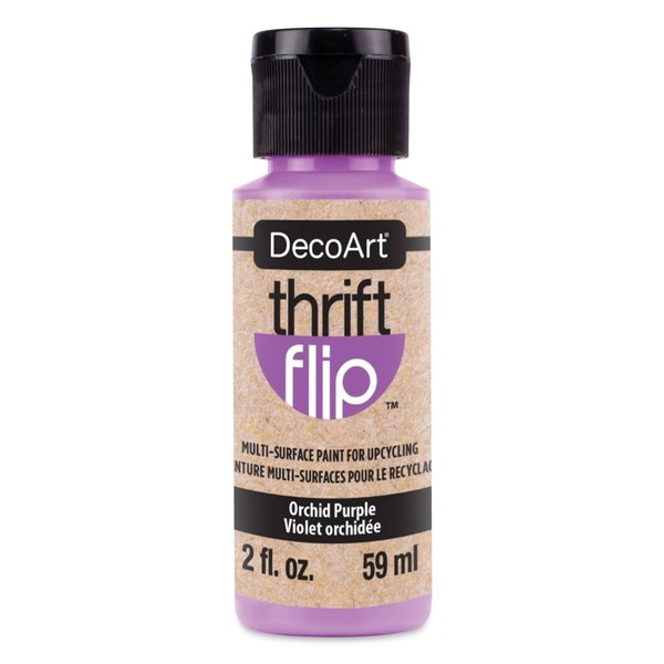 Upcycle virtually any thrift store treasure or flea market find with the rich hues and durable satin finish of DecoArt Thrift Flip Multi-Surface Paint. Add gold accents to furniture, personalize planters with a bright splash of color, or revitalize kitschy home decor with a few painterly strokes. Specially formulated to resist flaking, cracking, and crazing, this permanent indoor/outdoor paint dries soft and flexible. It can be applied to wood, canvas, papier mâché, terra cotta, most plastics, ceramics, bisque, concrete, and more. - DecoArt Thrift Flip Multi-Surface Paint - Orchid Purple, 2 ozThriftflip, ORCHID PURPLE -