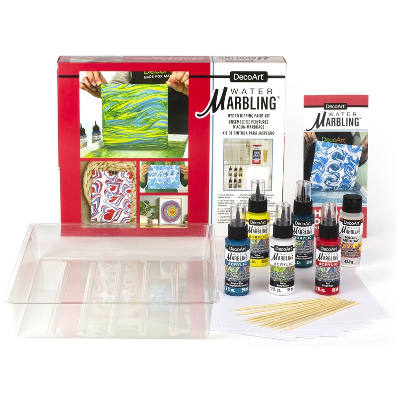 • DecoArt Water Marbling Starter Kit Everything you need to get dipping in one easy kit! This package contains one clear plastic tray, ten pieces of 8.5x11 inch marbling paper, five 2oz squeeze bottles of DecoArt Water Marbling Acrylic Colors, one 2oz jar of DecoArt Marbling Magic Medium, just mix in hot water, Ten marbling stick tools and one easy step-by-step instructions and technique guide