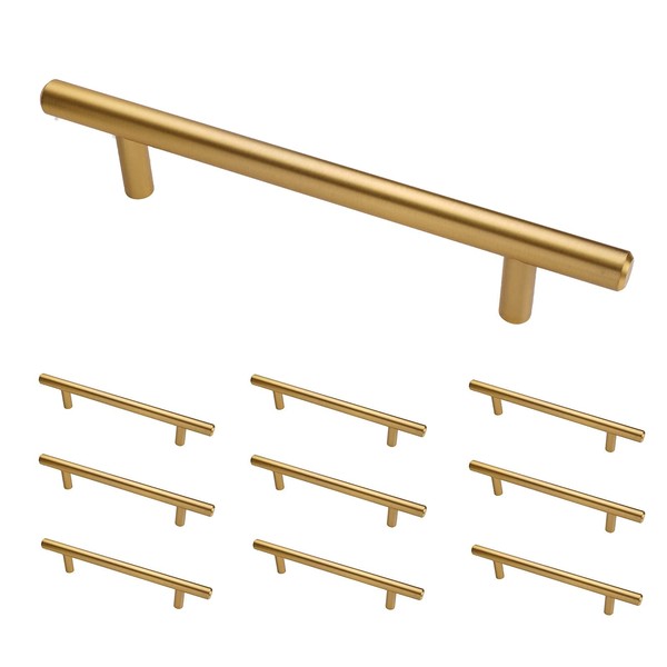 DecoBasics (10 Pack Solid Stainless Steel -Hole Centers 5"(128mm)-Brass Polished- Euro Bar Pull Handle for Kitchen Bath Cabinet Door and Drawer