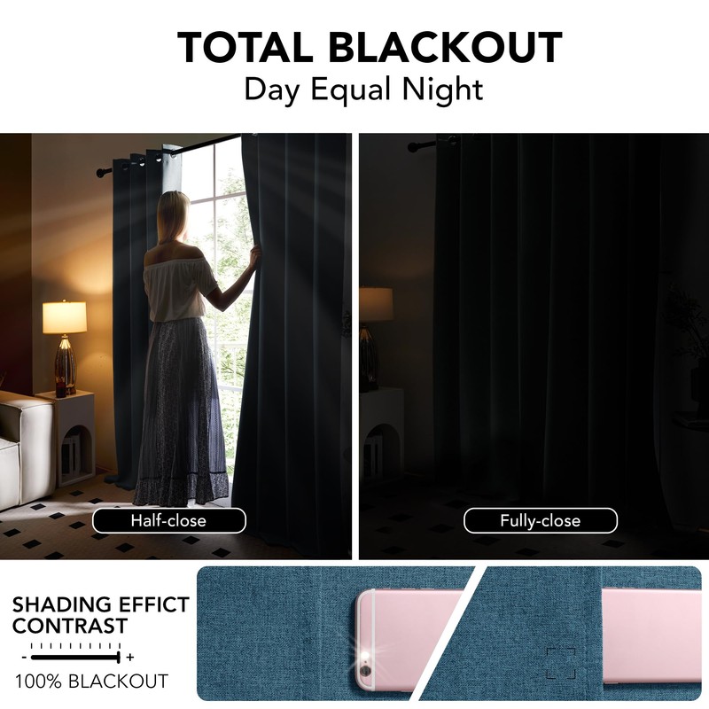 - FUNCTION CURTAINS: Super heavy and soft blackout curtain panels are very upmarket. Besides, light blocking, thermal insulated, soundproof, Fade-resistant, energy-efficient. Thread trimmed and wrinkle-free, both sides are the same color.