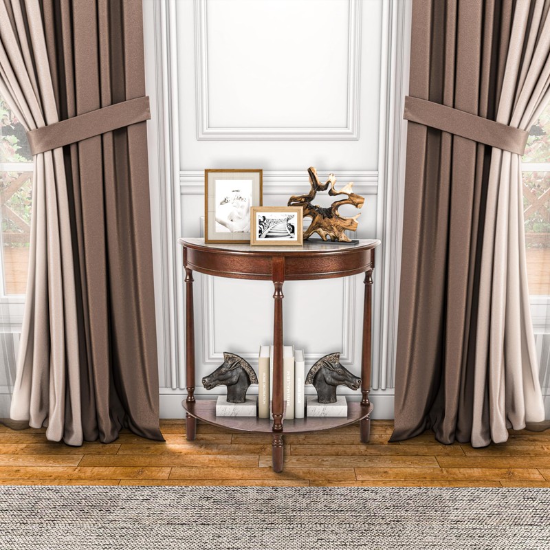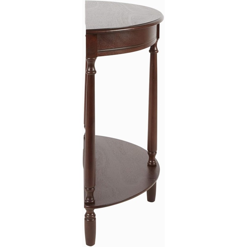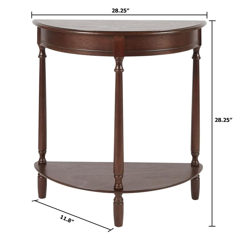 The traditionally designed half round console table is a multipurpose accent table. Imagine it greeting guests in the entryway, dressing a blank living room wall or even providing storage in a home office. A lower shelf doubles your storage capability. An elegant Walnut finish creates a stately look while the solids and MDF construction creates long lasting durability-combined this is timeless, functional console table. Easy to assemble. Table measures 28.25w 11.8d 28.25h