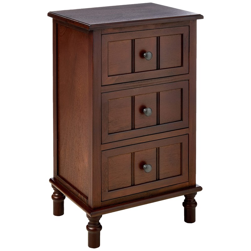 Design and functionality meet in harmony with the three drawer accent table. This accent chest can be used to as an end table next to your sofa to showcase a table lamp, or in an office to store supplies. It has a timeless Walnut finish that could be transitional for any décor. Constructed of sturdy solids and MDF. Table measures 15.75 x 11.8 x 26".