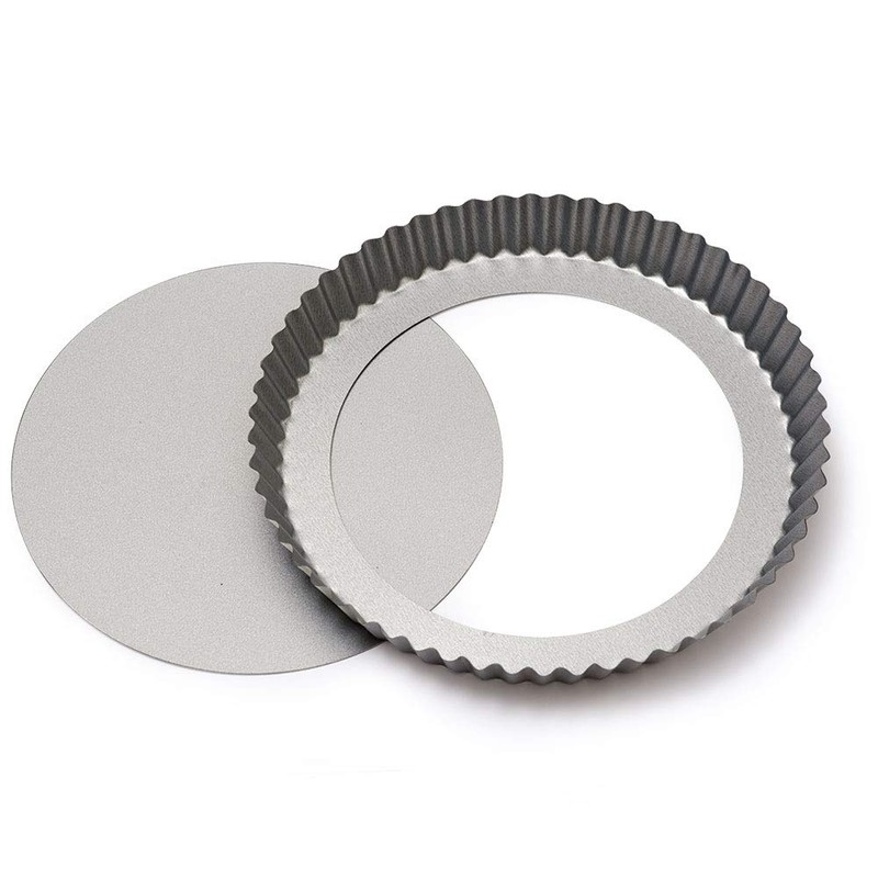 - Contents: at home you will receive a round cake tin with removable base, diameter 28 x height 3.5 cm. The removable base of this product makes it easy to remove the pastries you prepare without compromising the aesthetic appearance. The mould is made of non-stick steel.