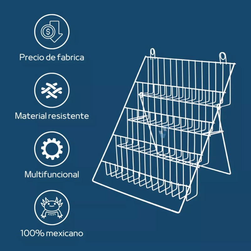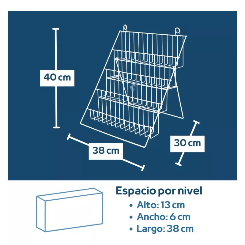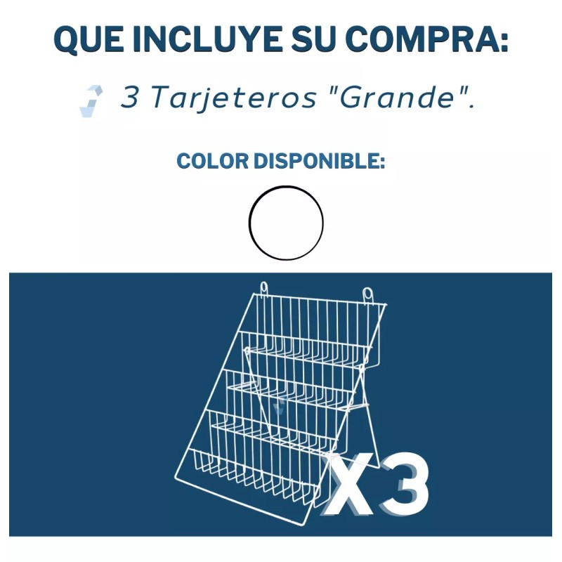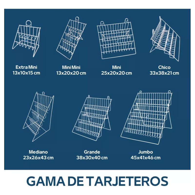 Con dimensiones impresionantes de 38 cm de largo, 30 cm de ancho y 40 cm de alto, el Tarjero Grande destaca en cualquier espacio sin comprometer su funcionalidad. Cada nivel de este tarjetero ha sido cuidadosamente diseñado, con medidas de 6 cm de ancho, 13 cm de alto y 38 cm de largo, brindándole suficiente espacio para exhibir sus productos de manera organizada y visualmente atractiva. ¡Sus clientes se sentirán cautivados por la presentación impecable que ofrece el Tarjero Grande!