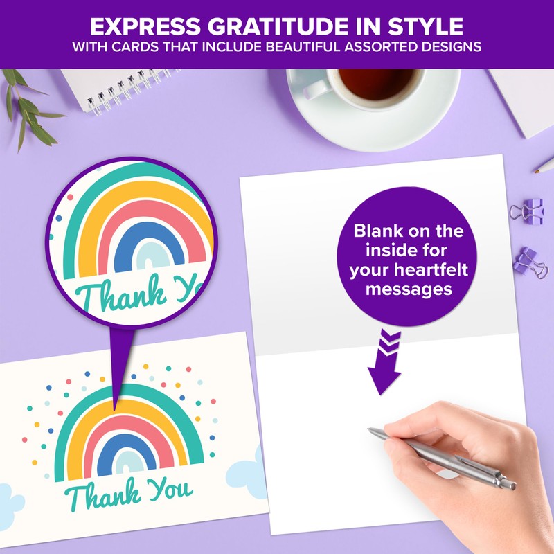 - MATCHING ENVELOPES & STICKERS - Get a total of 24 assorted pack of thank you notes in 24 unique designs, 24 envelopes with pre-water soluble gum closure in 4 designs & printed lining, & 24 stickers in 24 matching designs. Mix & match as you like!