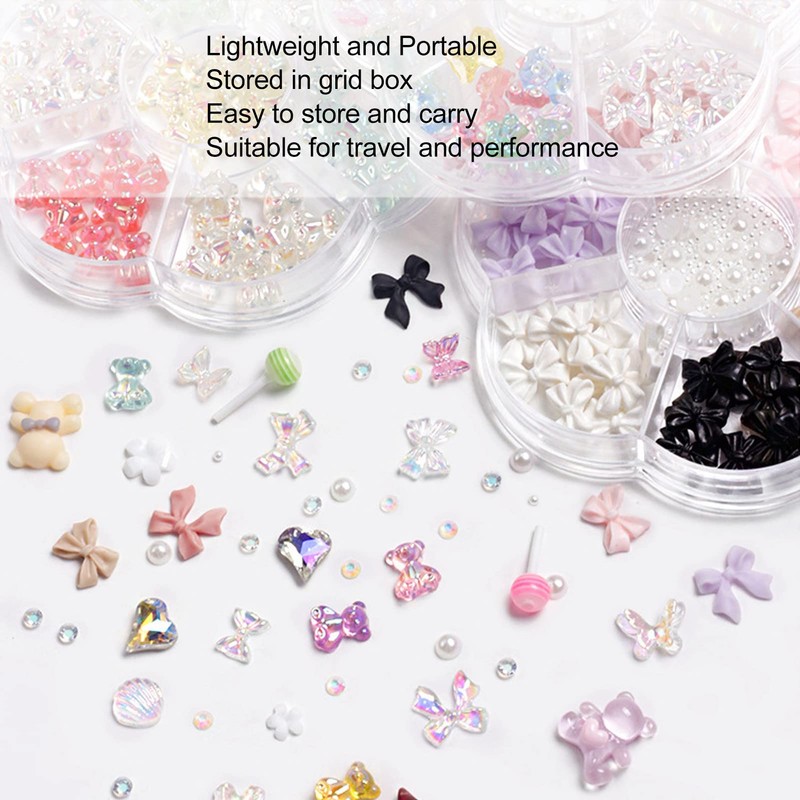 - LIGERO Y PORTÁTIL: estas decoraciones para uñas se almacenan en una caja de rejilla, muy convenientes para almacenar y transportar, adecuadas para viajes y presentaciones.