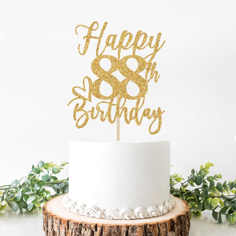 Decoración para tartas de feliz cumpleaños 88, decoraciones de cumpleaños 88 para hombres/mujeres, saludos a 88 años, suministros para fiesta de cumpleaños 88, 88, purpurina dorada