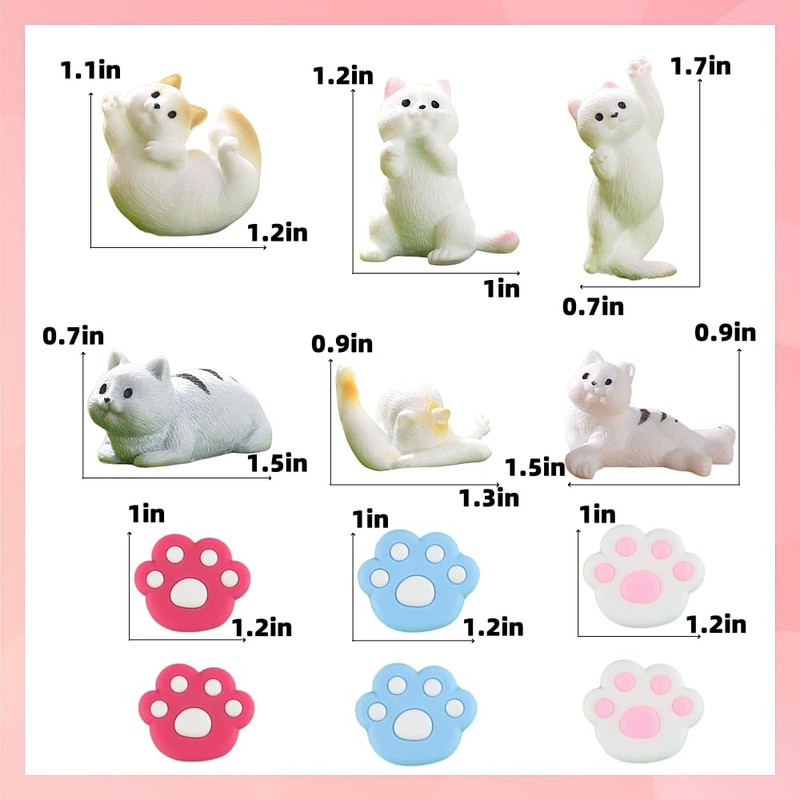 - El paquete incluye: El paquete contiene 36 suministros de decoración de tartas de gato, 6 adornos de tartas de gato, 6 huellas de gato, 8 adornos de bolas de lana, 1 adorno para tartas de casa de gato, 15 adornos para tartas de bolas, tamaño del producto como se muestra en la imagen.