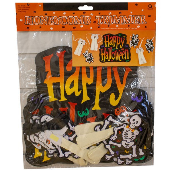- Happy Halloween Banner measures 12 ft long and is made from honeycomb paper.