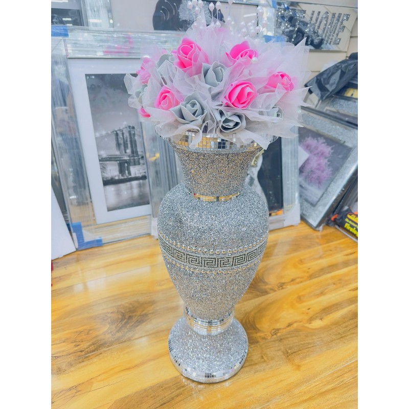 Decorative Glitter Vase with Pink and Grey Roses, Silver Mosaic Design, Crushed Diamond Effect