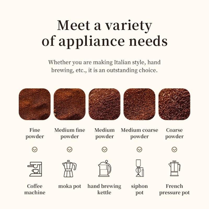 - Portable Conical Burr Grinder::Best for travel and camping,compact design but large bean and bin capacity,features a sleek, travel-friendly size, perfect for on-the-go brewing or camping trips.The height is 5.63inch(143mm),the net weight 180 gram,such like a mobile phone.The bean storage capacity is 19g,and the powder silo capacity is 36g,which is sufficient for producing 3 cups of fresh coffee.Barely takes up any space and grinds away! Great for Drip Coffee, Espresso, French Press, Turkish Brew.