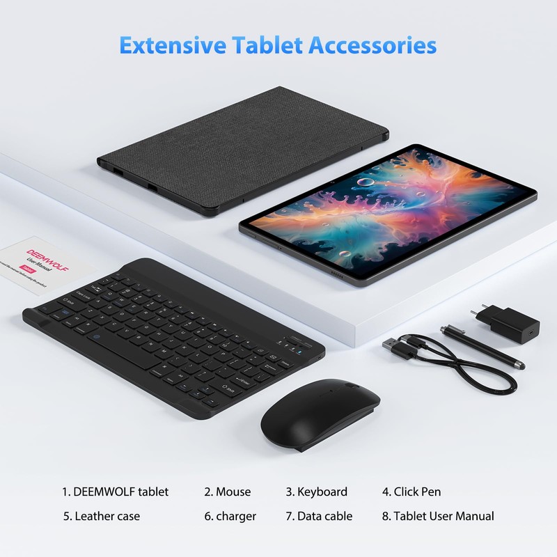 - 🎁Rich gifts + multifunctional tablet + two years of after-sales service🎁 Purchase of the DEEMWOLF 4G LTE tablet includes a mouse, Bluetooth keyboard,protective case,stylus pen,Type-C cable, charger, and user manual. Supports navigation (Beidou, Galileo,Glonass,GPS) and screen sharing, parental controls,and facial recognition. DEEMWOLF tablets offer two years of premium after-sales service and long-term technical support. If you encounter any issues, please contact the DEEMWOLF after-sales team via Amazon, and we will respond within 24 hours.