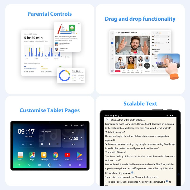 - 📺Android 15 + 2.0 GHz Octa-Core Processor📺DEEMWOLF 11-inch Tablet is equipped with the latest Android 15 operating system, which boots up 20% faster compared to Android 14.New access management system allows you to authorize each app more accurately and securely,effectively protecting your personal data. Intelligent AI optimization,new gesture touch mode,global dark mode and other new features make your tablet more personalized.