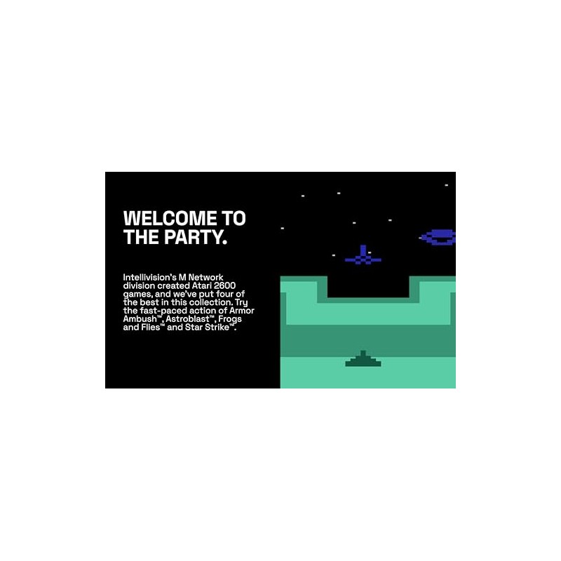 ARE YOU READY FOR THIS CHALLENGE? In 1982, Mattel Electronics spawned a separate games division, dubbed M Network, to create versions of its popular Intellivision games for the Atari 2600. This game collection re-releases four of those fast-paced Atari 2600 classics, showcasing just a sample of the M Network challenge! Get ready for the fast-paced action of Armor Ambush, Astroblast, Frogs and Flies, and Star Strike. ? 1 or 2 player modes ? Set the game's integrated dip switches to the desired position and play it like a standard Atari cartridge ? Original Programming Credits: Armor Ambush: Hal Finney Astroblast: Hal Finney Frogs and Files: Dave Rolfe Star Strike: Dave Akers and Patricia Lewis Du Long ? Compatible with Atari 2600+, 2600, 7800+, and 7800 consoles