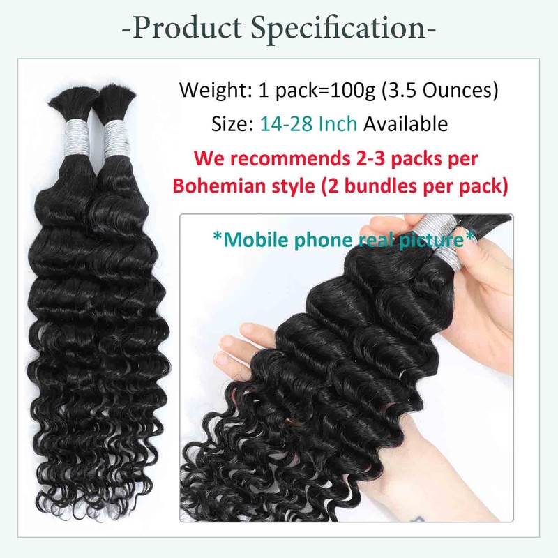 - Special Attension: Deep wave human hair bulk is 100g (about 3.6 ounces)/pack, including 2 human hair bundles for braiding. If you want to do a full Bohimian braids, for a full boho look, we recommend you buy 3 or 4 packs. And our details page lists the effects of using 100g, 200g, and 300g respectively for your reference. It alao depends on your hair length.