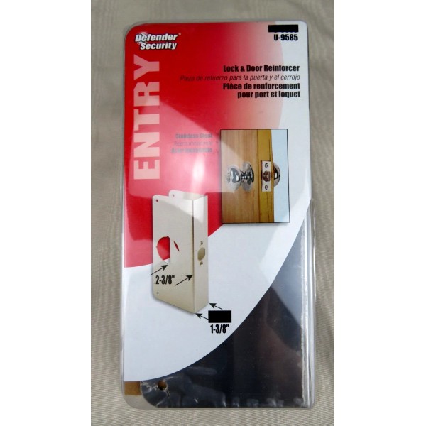 Defender Security U 9585 Stainless Steel Lock and Door Reinforcer assists in preventing forced entry by reinforcing the weak spot of an entry door. It can be used to reinforce and repair both metal and wood doors. Made of stainless steel construction, the lock reinforcer plate comes finished in stainless steel. All the necessary mounting hardware is included for a quick and easy installation. The lock reinforcement plate is pre-punched for mounting. The reinforcer is designed for 1-3/8 inch thick doors that have mortise or drive-in latches. It features one 2-1/8 inch bore with a 2-3/8 inch backset. The door reinforcer is non-recessed. Please refer to the line art drawing for dimensions and compare to your needs before purchasing (Not Universal).